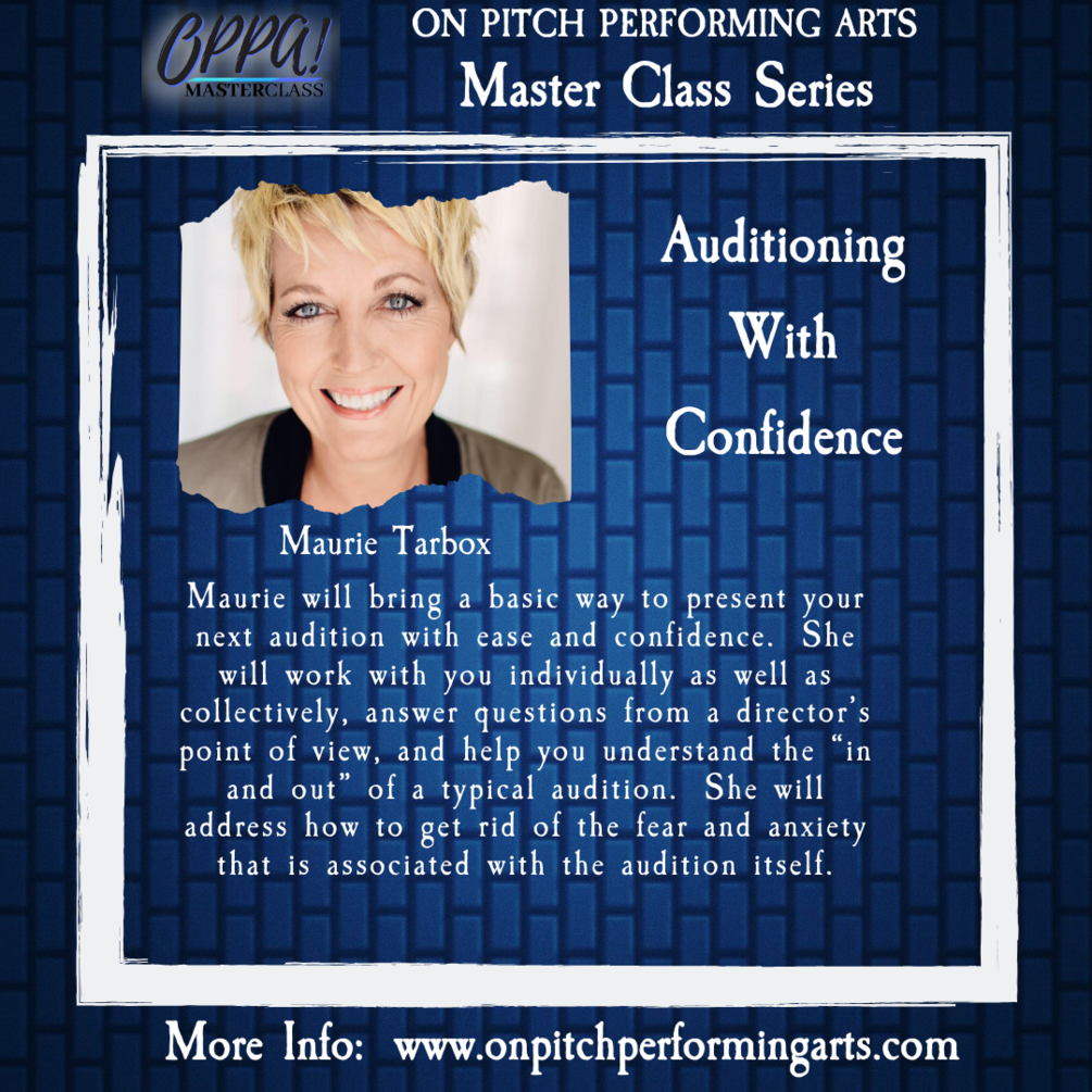 Maurie will bring a basic way to present your next audition with ease and confidence. She will work with you individually as well as collectively, answer questions from a director’s point of view, and help you understand the “in and out” of a typical audition. She will address how to get rid of the fear and anxiety that is associated with the audition itself.